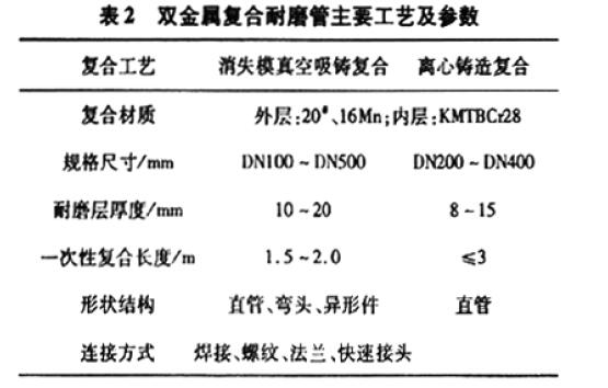 單一材質(zhì)的鋼管由于耐磨性較差、很難滿足充填量的要求,因此較少采用;目前使用較為廣泛的充填管道主要有自蔓延陶瓷復(fù)合管、高分子鋼塑復(fù)合管、雙金屬復(fù)合耐磨管等。自蔓延陶瓷復(fù)合管其陶瓷層本身為含有玻璃相的脆性材料,且復(fù)合厚度也很薄,抗變形能力很差,同時(shí)由于不是在高壓下成形,并受到多種制造工藝因素的影響,致使陶瓷層孔隙率很高,組織疏松,致密度很低,一般存在很多裂紋,在硬物料的高壓高速?zèng)_擊下很容易碎裂剝落,造成早期失效,只能適用于低應(yīng)力和軟磨料工況;鋼塑復(fù)合管其內(nèi)層為柔韌性很高的高分子材料,具有很高的耐腐蝕性能,對(duì)于充填輸送工況,由于介質(zhì)中存在大量大顆粒、尖銳物料,在高速反復(fù)沖刷下,產(chǎn)生“刀具”效應(yīng),很容易將內(nèi)襯高分子材料劃破,導(dǎo)致成片剝起和大面積脫落,堵塞管路,嚴(yán)重時(shí)造成鉆井報(bào)廢,因此在采礦充填中使用受到很大限制;雙金屬復(fù)合耐磨管道具有良好的抗沖刷磨損能力和承壓抗沖擊能力,性能優(yōu)勢(shì)明顯,完全可以滿足采礦充填輸送管道的工況要求。
